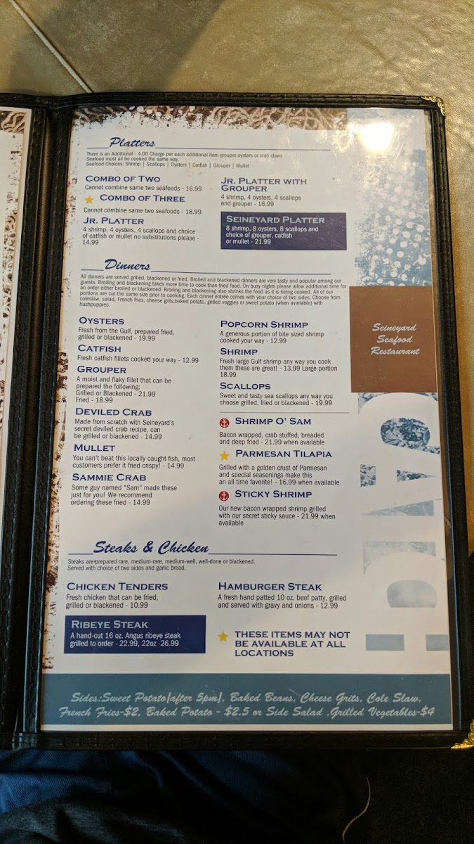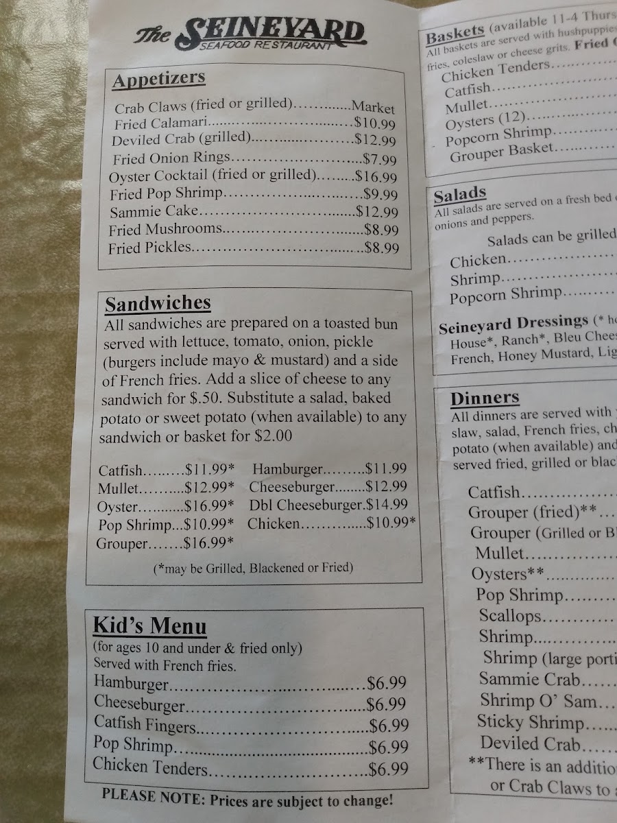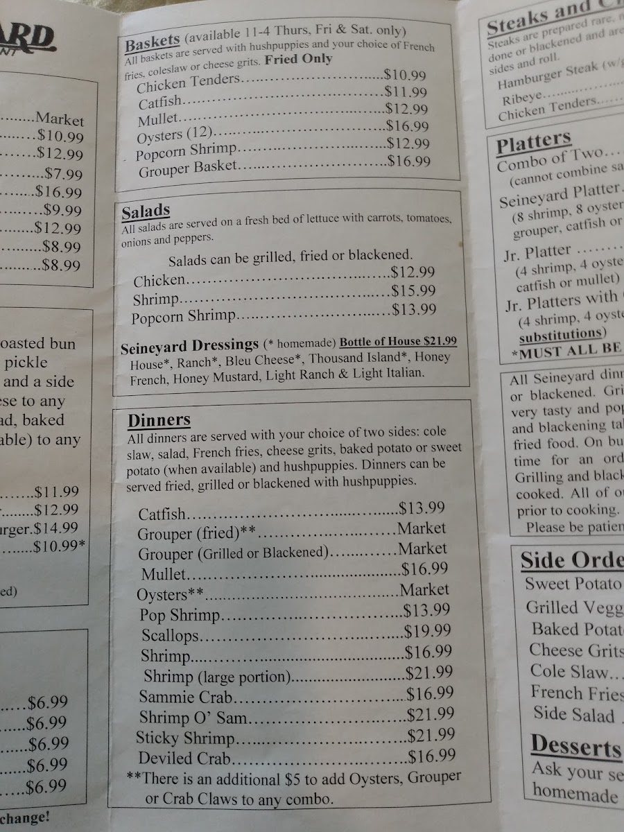 Introducing the menu at The Seineyard at Wildwood, located in Crawfordville, FL, is a delightful culinary experience that merges savory seafood with heartfelt hospitality. The restaurant is particularly renowned for its offerings, ranging from perfectly fried catfish to succulent shrimp, creating a paradise for seafood lovers. Customers rave about the hush puppies and cheese grits, which accompany meals that are generous in portion and flavor. The atmosphere is enhanced by live entertainment, making each visit memorable.